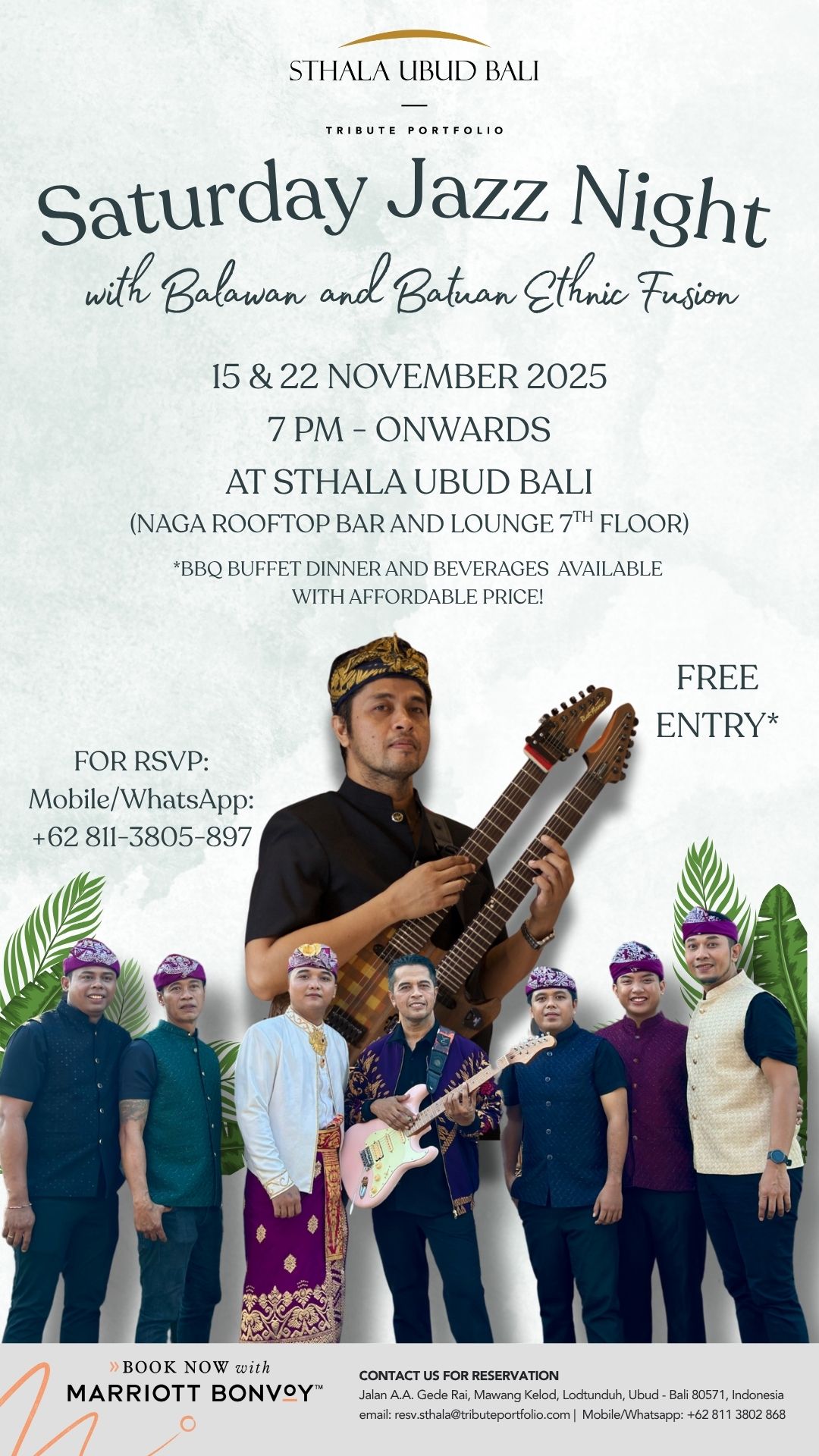 Experience the magic of Saturday Jazz Night featuring the incredible guitar maestro, Balawan, and the mesmerizing sounds of Batuan Ethnic Fusion! Nothing beats the fun of enjoying the jazz night surrounded by Ubud's lush greenery and the serene Wos River from the 7th floor of Naga Rooftop Bar and Lounge.